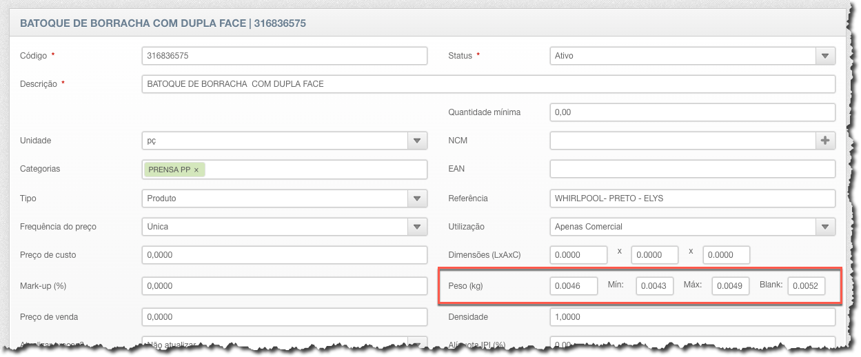 - Para produtos PRENSADOS, o cálculo do peso é feito pelo peso blank (exemplo 0,052 kg).